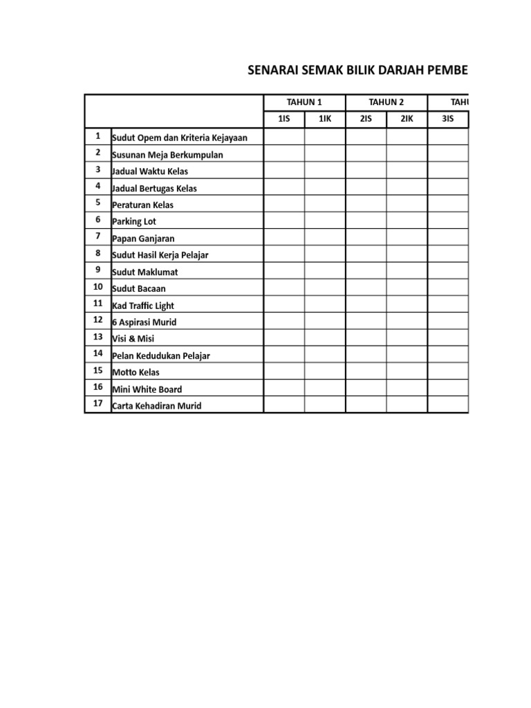 Up to 3 cash back Save Save SENARAI SEMAK BILIK DARJAH ABAD KE 21docx For Later. Guru-guru kelas dan guru bilik-bilik khas sila gunakan. SENARAI SEMAK KELAS ABAD KE 21 PELAN PEMBANGUNAN PENDIDIKAN MALAYSIA 2013-2025 SEKOLAH PEMERHATI TARIKH MASA FOKUS ELEMEN CATATAN.